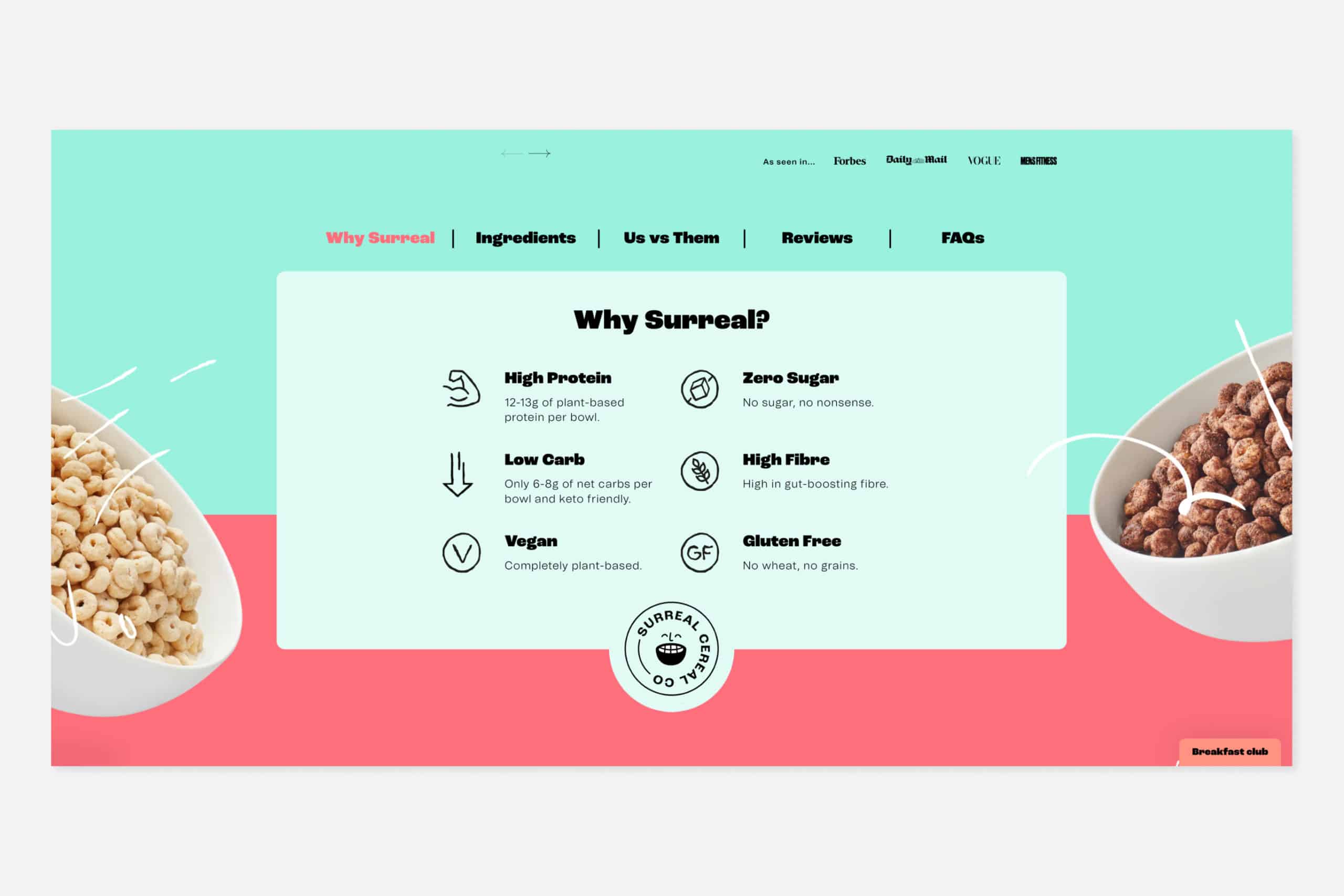 Surreal Cereal adds interest to its ecommerce site by animating images and throughout.