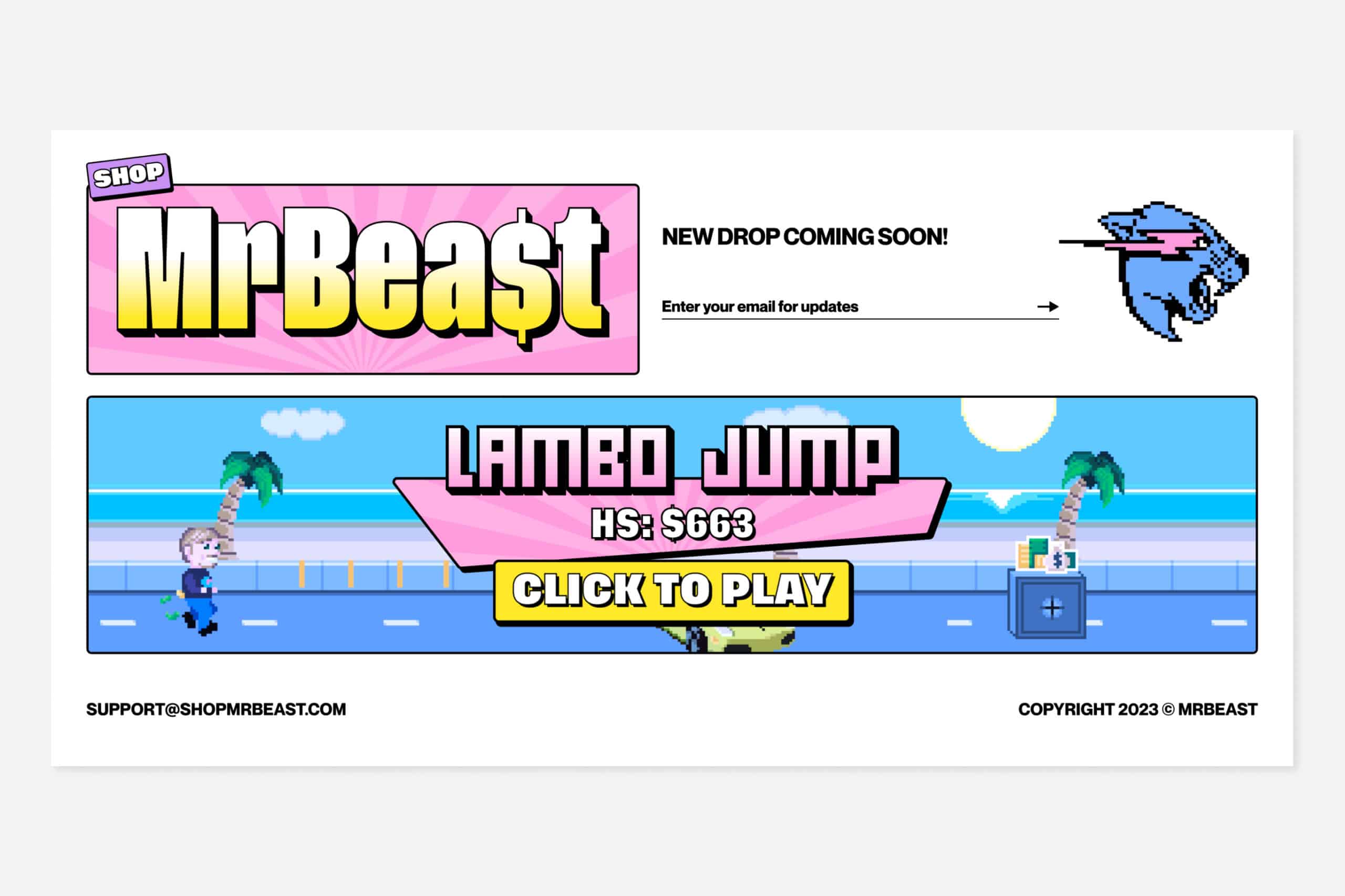 Y2K aesthetics, pixel-style artwork, bright colours, and custom typefaces remind us of early websites, especially on the Mr Beast Shop site.