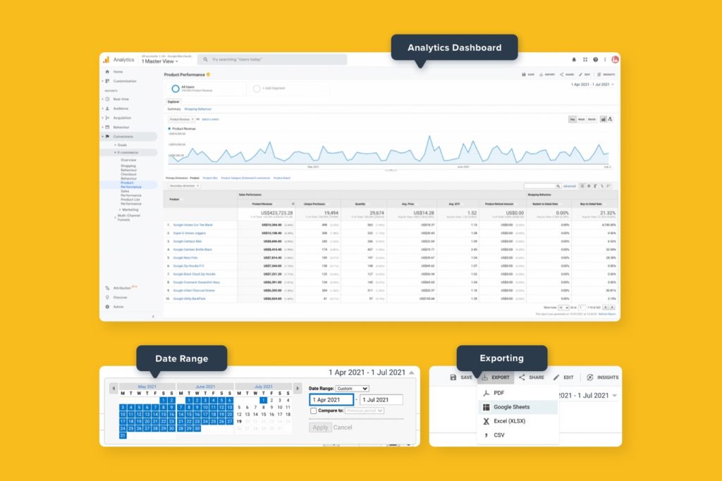 We recommend exporting to Google Sheets using the export button in the top right of the page. Make sure to add the date range that the data is from, to make it easier when you compare with data after implementing changes based on your research.