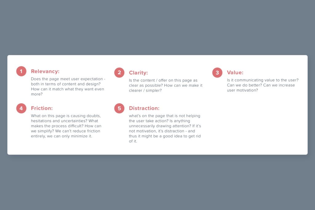Relevancy – does the page meet user expectation – both in terms of content and design? How can it match what they want even more?