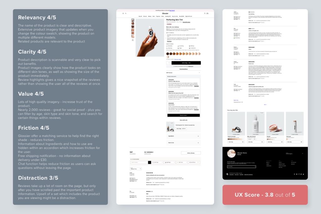 Although it isn’t perfect, Glossier have a great product page design that meets the users expectations, is clear and doesn’t create much friction.