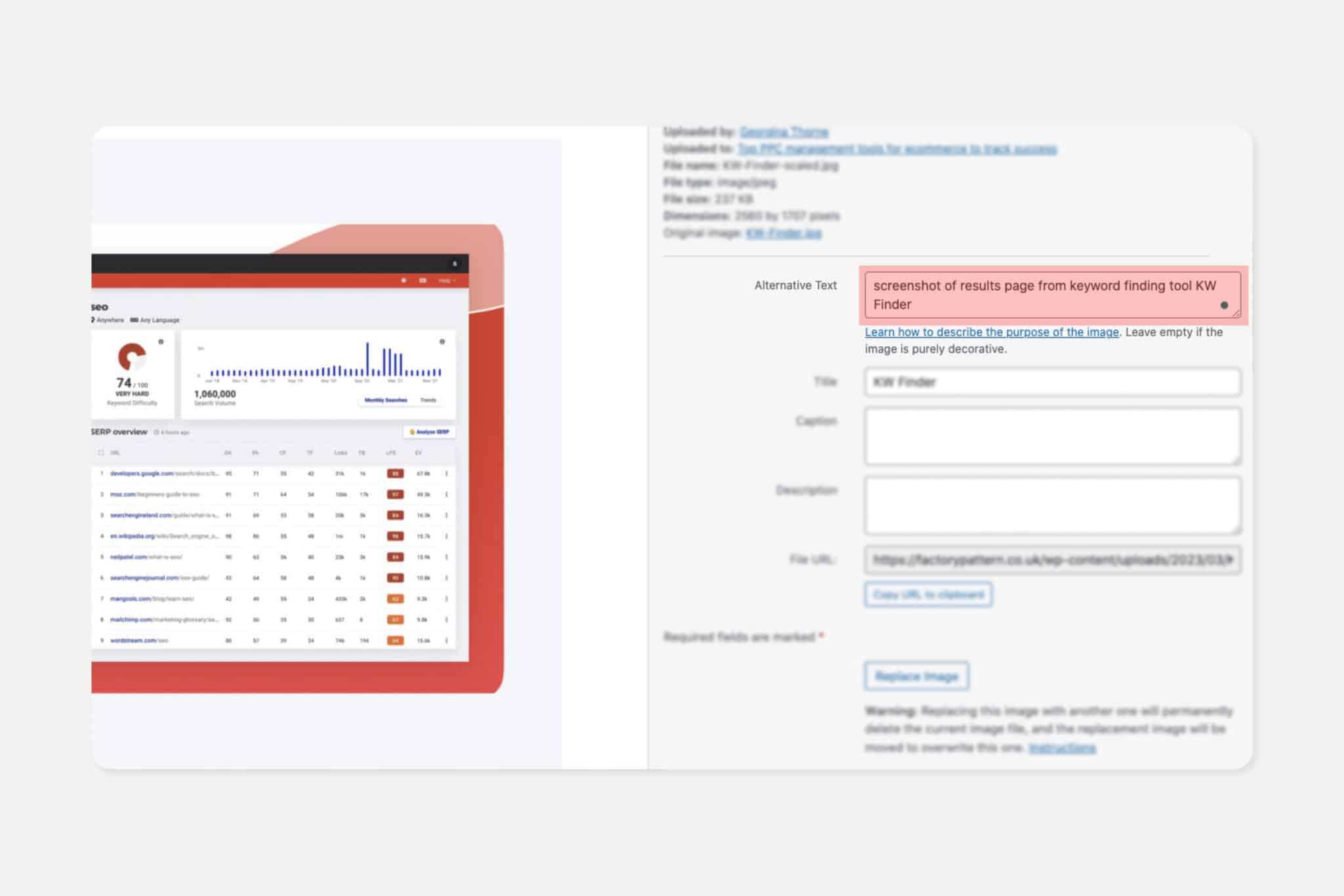 Image alt-text tells search engines what your image is about. Adding alt-text to your images will make sure Google can display your content in image-based results and text results. It’s also great practice from a UX perspective too, as it makes your content more accessible to screen readers.