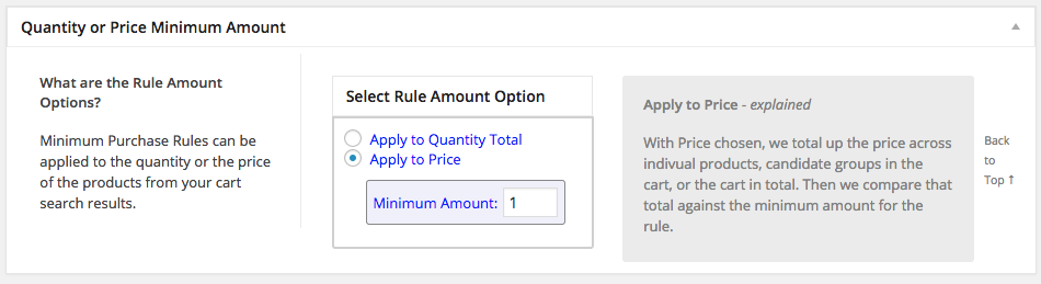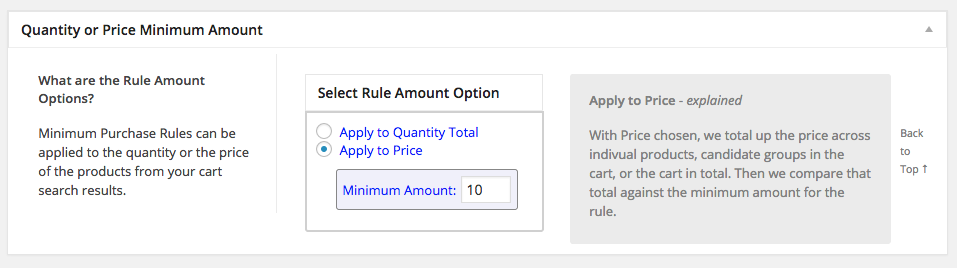 And finally, in the 'Quantity or Price minimum amount' choose 'Apply to price'