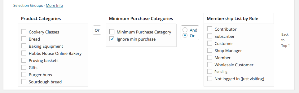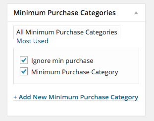 Look for the box labelled 'Minimum Purchase Categories' and tick the category 'Ignore min purchase rule' plus the Minimum Purchase Category'