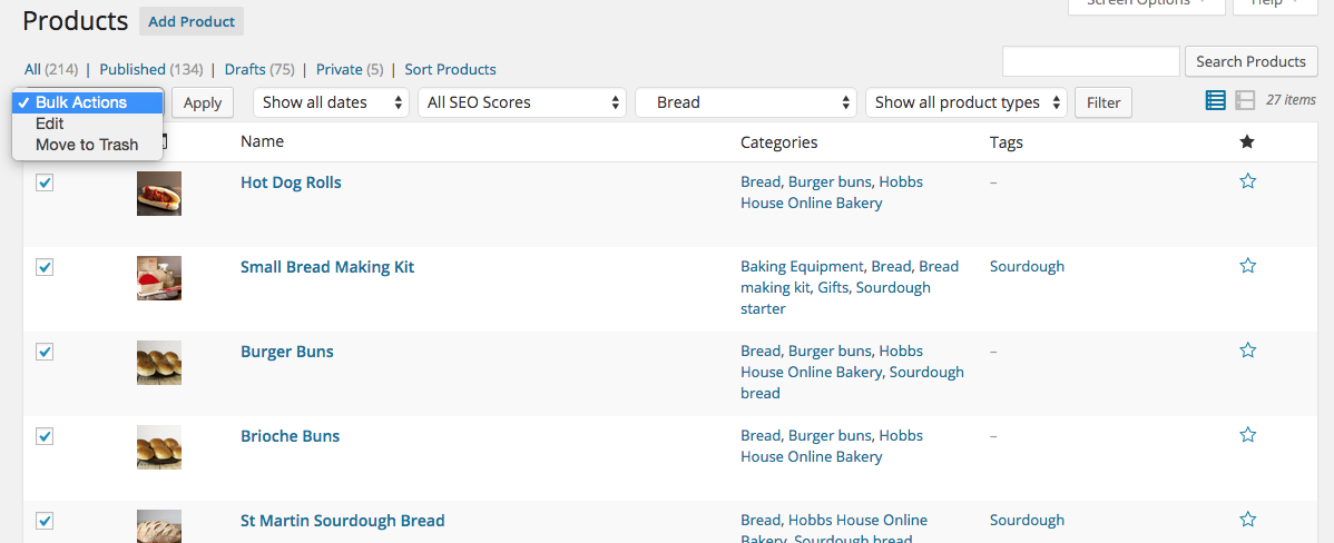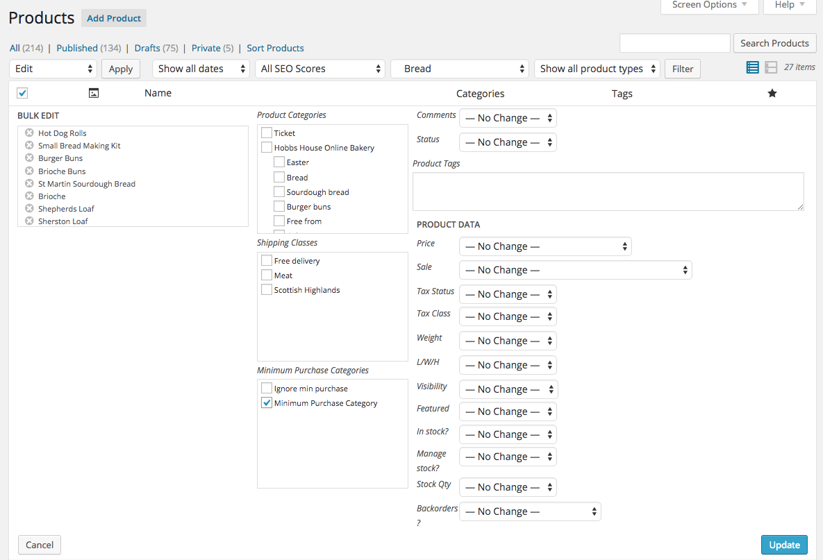 Go to 'Products', select all products, tick all products and choose 'Edit' from the bulk actions dropdown menu. Click 'Apply'
